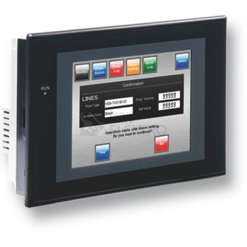Programovatelný terminál (HMI), 5.7 palce, STN, 256 barev (4,096 barev pro .BMP/.JPG), 320x240 pixelů, 2 x RS232 porty, 60Mbytů paměť, 24VDC, černý kryt
