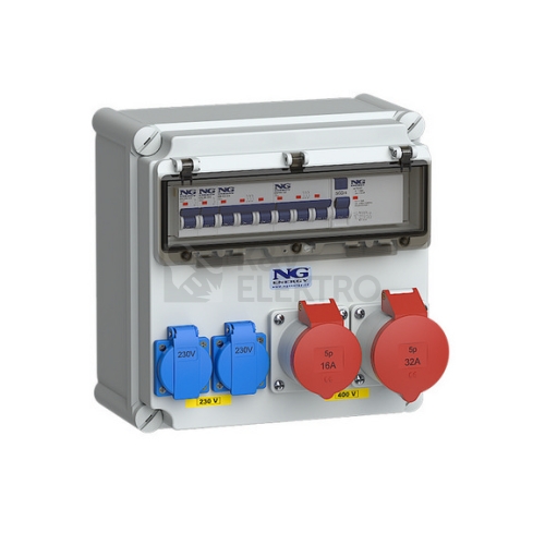 Zásuvka 1x CEE 32A 5p 400V, 1x CEE 16A 5p 400V, 2x 16A 230V, chránič 4p, jističe