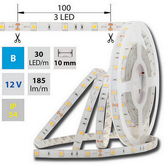LED pásek SMD5050, 460-475nm (modrá), 7,2W, 30LED, 185lm, segment 100mm, 3LED/segment, IP54, DC 12V, životnost 35000h, šíře 10mm, bílý PCB pásek, max. délka pásku při jednostranném zapojení: 5m, opatřen samolepící páskou 3M.