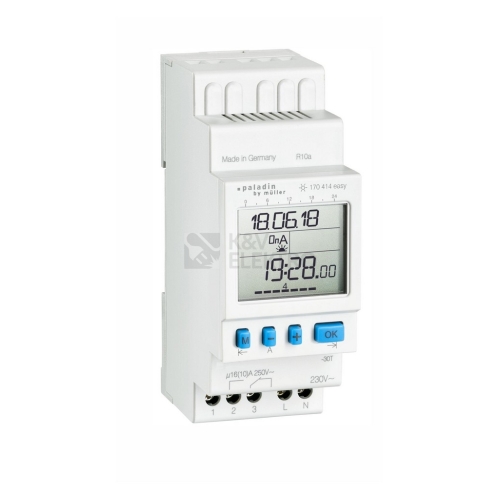 Hodiny spínací PALADIN 170414easy, digitální, ASTRONOMICKÉ, 1kanál, 2moduly, se zálohou, šedé, na DIN, NFC, týdenní, 56 úložných míst