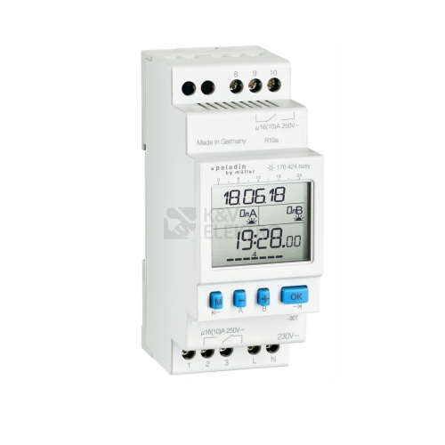Hodiny spínací PALADIN 170424easy, digitální, ASTRONOMICKÉ, 2kanály, 2moduly, se zálohou, šedé, na DIN, NFC, týdenní program, 56 úložných míst
