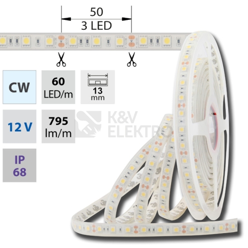 LED pásek SMD5050, 5800-6100K (studeně bílá), 14,4W, 60LED, 795lm, segment 50mm, 3LED/segment, IP68, DC 12V, životnost 35000h, šíře 13mm, bílý PCB pásek, max. délka pásku při jednostranném zapojení: 5m, opatřen samolepící páskou 3M. Páska pouze usnadňuje montáž, fixace pomocí spon je nezbytná.