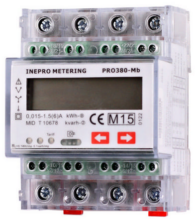 Třífázový dvousazbový elektroměr na lištu DIN, úředně ověřený s českým protokolem o ověření stanoveného měřidla, LCD, rozhraní M-Bus, rozhraní IR, 2x impulsní výstup, odběr/dodávka, 4Q měření, programovatelný, jedno/dvousazbové měření, zobrazení podrobných parametrů sítě (U,V W pro jednotlivé fáze), nepřímé měření s měřícími transformátory, funkce nastavení převodu připojených měřících traf