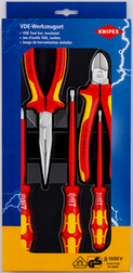 Nářadí v plastovém hlubokotažném obalu s průhledným víkem. Atraktivní prodejní balení s děrováním pro samoobslužný prodej. Rozměry vnější (Š x V x H): 170 x 370 x 40 mm. Nářadí s certifikací VDE podle DIN EN/IEC 60900 1000 V, kleště chromované, rukojeti s vícesložkovým potahem. Se 3 šroubováky WERA.