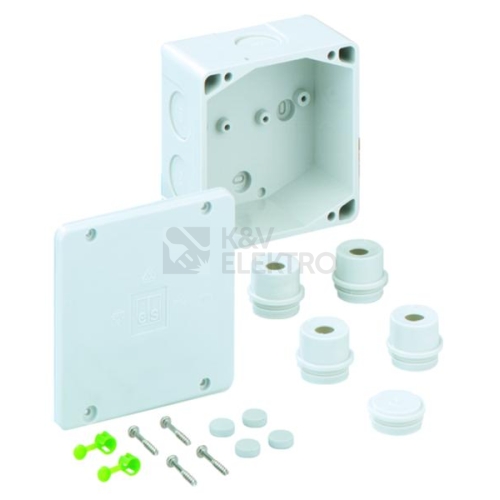 Spojovací krabice, se stupněm krytí IP54, Jmenovitý průřez 10mm², Ui=690V AC, Certifikováno podle VDE (DIN EN 60670-1/-22 (VDE 0606-1/-22)), Vyrážecí membrány, M32, (7 z boku), Vnitřní místa pro připevnění, pro standardní instalace ve vnitřním prostoru, šedá, bez svorek, Rozměry: 115 x 115 x 66mm, Přiložené příslušenství: 4 Vývodka IP54 M32 Rozsah těsnění 13-23mm, 1 Zaslepovací zátky M32, 1 Plombovací souprava