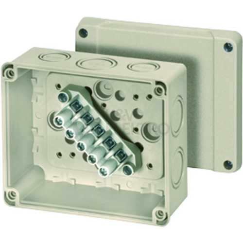 Kabelové rozvodky podle IEC 60670-22, s namontovanou spojovací svorkou a metrickými predlisy . Urceno pro vnitrní prostredí a nechránené venkovní instalace podle DIN VDE 0100, díl 737. pro teplotu prostredí max. + 70 °C a min. - 25 °C, pri relativní vlhkosti vzduchu 50% pri 40 °C nebo 100% pri 25 °C. Tepelná odolnost materiálu od - 25 °C do 90 °C, Odolnost proti požáru podle VDE 0471, díl 2 - Zkouška žhavou smyckou 750 °C, UL Subject 94 V-2. Krytí podle IEC 60529: IP 66 s kabelovými vývodkami ASM. Jmenovité izolacní napetí: 690 V, DIN VDE 0110. Materiál: PC-GFS-Termoplast, zesílený skelným vláknem povetrnosti odolné, bez halogenu a bez silikonu. Barva: šedá, RAL 7032. Upevnovací šrouby víka z nerezové oceli V2A. Výrobek: HENSEL DK. Jmenovitý prurez: 6 mm², 5pol.svorka