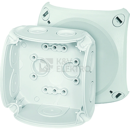 Kabelová krabicová rozvodka z vysoce kvalitního termoplastu. Pro nástěnné aplikace v budovách nebo chráněnou instalaci ve venkovním prostředí. Se stěnovými úchyty a upevněním víka pomocí rychlouzávěrů. Kabelová krabicová rozvodka bez svorek. Kabelový vstup přes pružné těsnící membrány ve dně a stěnách skříně. Následné použití kabelových vývodek odstraněním těsnící membrány je možné. S páskem pro uchycení víka.
