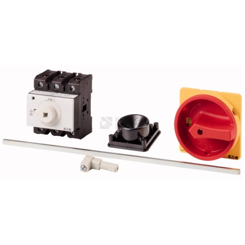 Hlavní spínač, Sortiment: Hlavní vypínač, Přepínač údržby, Vypínače pro opravy, Označení typu: P3, Funkce STOP: Funkce nouzového vypnutí, S červenou otočnou ovládací pákou a žlutou objímkou, Poznámky: Rukojeť povolena pouze ve spojení s osou P1/P3-400 (172844)., poznámka: S kovovou osou pro hloubku rozváděčové skříně 400 mm, Informace k rozsahu dodávky: Pomocný kontakt nebo neutrální vodič lze namontovat dodatečně., 3-pólové, Možnost uzamčení: Uzamykatelný v poloze 0, Stupeň krytí: Vpředu IP65, Provedení: Zadní montáž, Výkon motoru AC-23A, 50 - 60 Hz 400 V: P = 55 kW, Jmenovitý trvalý proud: Iu = 100 A, Normy a ustanovení: ČSN EN 60947, VDE 0660, ČSN EN 60204, Vypínače podle normy ČSN EN 60947-3