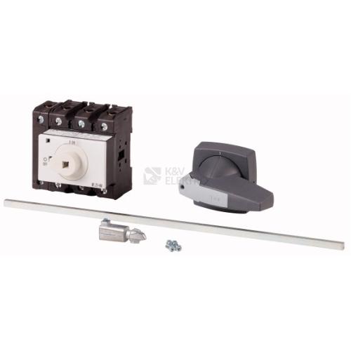 Hlavní spínač, Sortiment: Hlavní vypínač, Přepínač údržby, Vypínače pro opravy, Označení typu: P3, Funkce STOP: Funkce ZASTAVENÍ, s černou ovládací pákou a blokovacím věncem, poznámka: S kovovou osou pro hloubku rozváděčové skříně 400 mm, Informace k rozsahu dodávky: Pomocný kontakt lze namontovat dodatečně., 3-pólové + N, Možnost uzamčení: Uzamykatelný v poloze 0, Stupeň krytí: Vpředu IP65, Provedení: Zadní montáž, Výkon motoru AC-23A, 50 - 60 Hz 400 V: P = 55 kW, Jmenovitý trvalý proud: Iu = 100 A, Normy a ustanovení: ČSN EN 60947, VDE 0660, ČSN EN 60204, Vypínače podle normy ČSN EN 60947-3