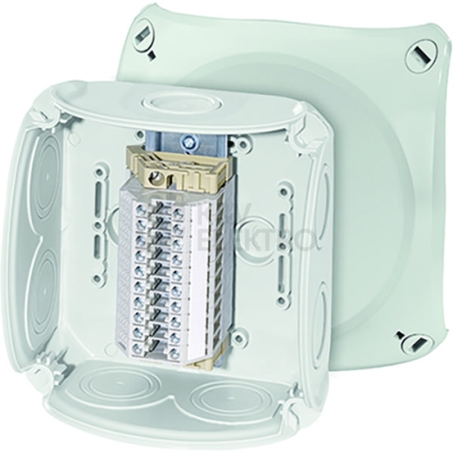 Kabelová krabicová rozvodka z vysoce kvalitního termoplastu s řadovými svorkami pro hliníkové a měděné vodiče. Pro nástěnné aplikace v budovách nebo chráněnou instalaci ve venkovním prostředí. Se stěnovými úchyty a upevněním víka pomocí rychlouzávěrů. S páskem pro uchycení víka. S 10 řadovými svorkami do 4 mm². Kabelový vstup přes pružné těsnící membrány ve dně a stěnách skříně. Následné použití kabelových vývodek odstraněním těsnící membrány je možné.