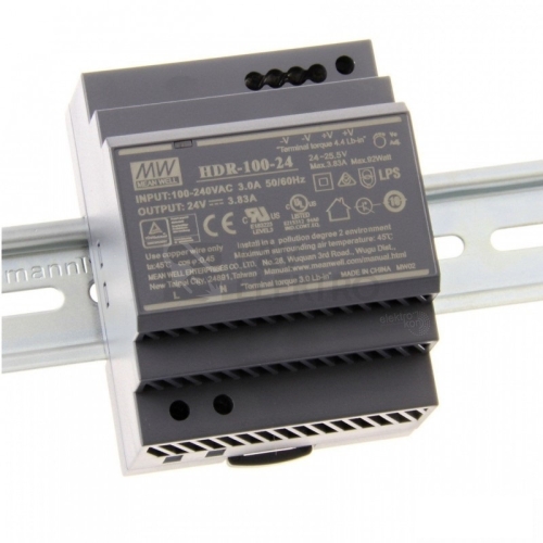 Spínaný zdroj na DIN lištu. Je vhodný pro použití v průmyslových i domácích kontrolních systémech, automatizaci budov, automatizaci výroby a elektromechanických přístrojích. Výkon: 92W Výstupní napětí: 24V Výstupní proud: 3,83A Univerzální vstup: 85 ~ 264VAC, 120 ~ 370VDC Ultra tenký design o šířce 70mm Spotřeba při běhu na prázdno < 0,3W Izolační třída II LPS Pasivní chlazení Nastavitelné DC napětí na výstupu LED indikátor provozu Určen pro DIN lištu TS-35/7,5 nebo 15 Účinnost: 90% Provozní teplota: -30 ~ +70°C MTBF: 856,5K hod. Rozměry: 70 x 90 x 54,5mm Hmotnost: 270g Typy ochrany: protizkratová, proti přetížení, přepěťová