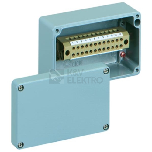 Skříň pro řadové svorkovnice, se stupněm krytí IP66, Jmenovitý průřez 4mm², Ui=400V AC, Hliník s práškovým lakováním, Vnitřní místa pro připevnění, pro instalace v průmyslovém prostředí a chráněném venkovním prostředí, osazené 12-pólovou blokovou svorkou 4mm² (typ Contaclip BKA 4), Rozměry: 125 x 80 x 57mm