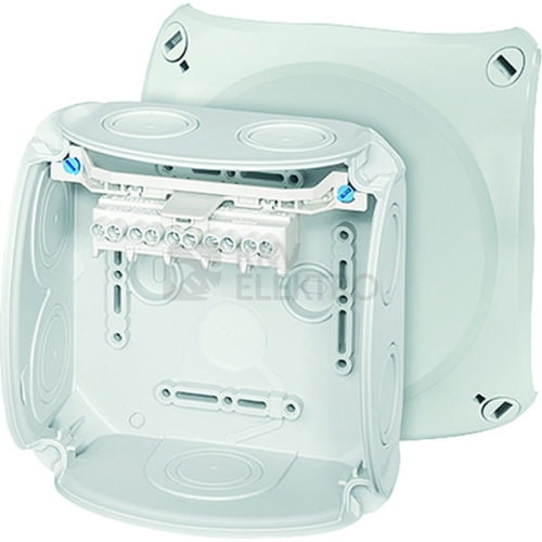 Kabelová krabicová rozvodka z vysoce kvalitního termoplastu. Pro nástěnné aplikace v budovách nebo chráněnou instalaci ve venkovním prostředí. Se stěnovými úchyty a upevněním víka pomocí rychlouzávěrů. S inovativní technologií provedení svorek do 4 mm², 5pólové. Kabelový vstup přes pružné těsnící membrány ve dně a stěnách skříně. Následné použití kabelových vývodek odstraněním těsnící membrány je možné. S páskem pro uchycení víka.