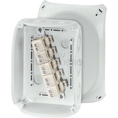 Kabelová krabicová rozvodka z vysoce kvalitního termoplastu pro nechráněnou instalaci ve venkovním prostředí nebo pro nástěnné aplikace v budovách. Odolné proti povětrnostním vlivům, jako například UV záření ze slunečního světla, chráněno proti dešťové vodě, teplotně stálé a nárazuvzdorné. Upevnění víka pomocí rychlouzávěrů. S vnějšími (stěnovými) úchyty. Odolné proti mořské vodě pro použití v přímořských oblastech. Se schválením pro instalaci na lodích. Svorkovnice se 2 svorkami na každý pól do 10 mm², 5pólová. Kabelový vstup přes metrické předlisy ve dně a stěnách skříně. Montážní kabelové vývodky součástí příslušenství. S páskem pro uchycení víka.