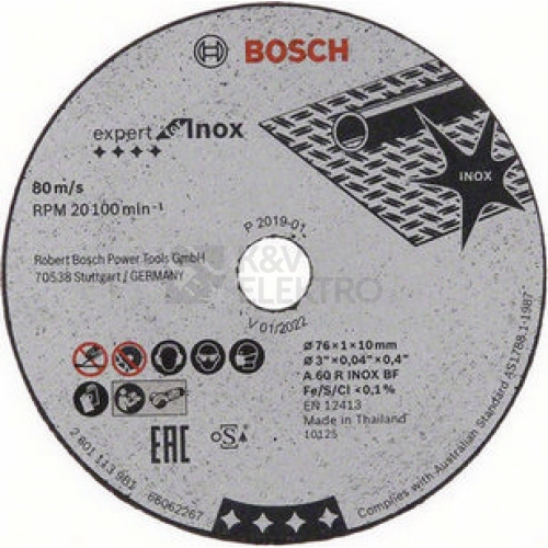 Řezný kotouč Expert for Inox poskytuje vysoký řezný výkon při řezání nerezové oceli s maximální bezpečností. Kotouč je vyroben ze špičkového velmi tvrdého oxidu hlinitého s funkčními plnivy a přísadami, jež snižují teplo uvolňující se při řezání. Vytváří tak velmi kvalitní povrch řezu a poskytuje dlouhou životnost. Dále kotouč neobsahuje železná, sirná ani chlórovaná plniva. Maximální bezpečnost práce zajišťuje přesně vyrobená síť ze skelných vláken. Tento kotouč používejte k řezání nerezové oceli. Řezné kotouče Bosch vyhovují požadavkům na maximální bezpečnost, např. EN 12413, FEPA a oSa. Je kompatibilní s úhlovými bruskami.