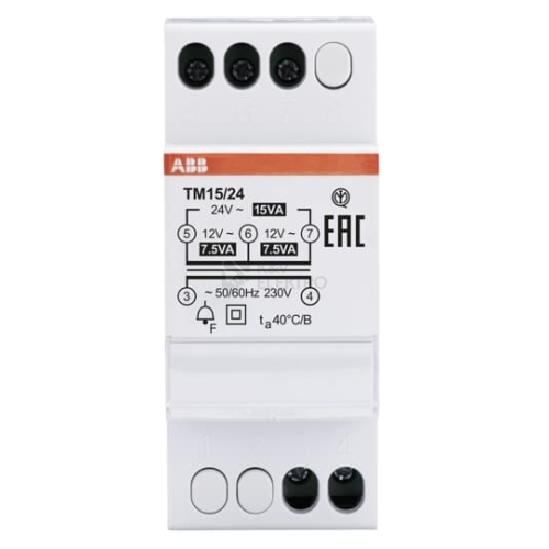 TM15/24, Zvonkový transformátor (bezpečný proti výpadku funkce), primární Un: 230V AC, 50-60Hz, sekundární Us: 12-24V/15VA