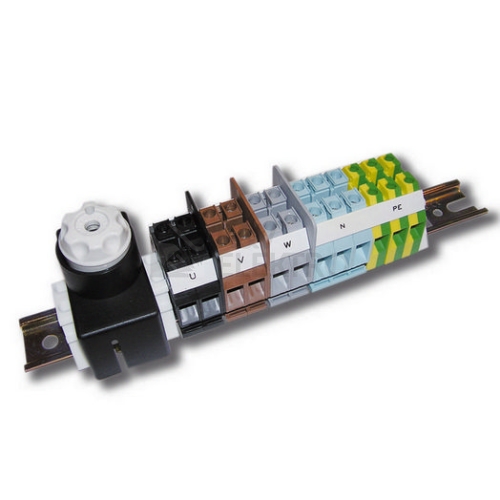 Odbočovací, pětivodičová svorkovnice s jedním držákem pojistky E27. Složení svorkovnice: 9 x RSA 16 A 3 x RSA PE 16 A Rozměry: A [mm] 75 B [mm] 83 C [mm] 216 C1 [mm] 40 L [mm] 300 • Materiál izolantu polyamid PA 6, hořlavost V0 dle UL 94, bez halogenů • Nadstandardní povrchová úprava spojovacích i elektrovodných částí • Možnost připojení hliníkových i měděných vodičů • Vodivě spojené svorky PE s lištou DIN • Krytí IP 20 bez nutnosti používání příslušenství či krytů (*) • Oddělení fázových svorek středovými přepážkami • Svorky v sestavách svorkovnic jsou označeny popisem • Certifikace státní zkušebny a soulad s normami EU