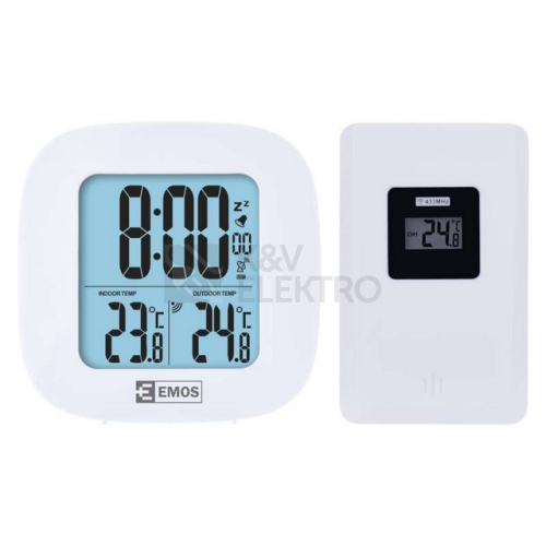 Bezdrátový teploměr se zobrazením venkovní a vnitřní teploty. Teploměr má bezdrátové čidlo s dosahem až 30 m. Hodiny řízené DCF signálem. Dobře viditelný podsvícený displej.