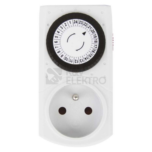 Mechanická spínací zásuvka s 24 hodinovým cyklem. Minimální nastavitelný časový úsek je 30 minut. Slouží pro časové spínání domácích spotřebičů (0–3680 W). Pokud potřebujeme zapnout a vypnout spotřebič v určitém časovém rozmezí (osvětlení akvárií, venkovní osvětlení, zavlažování zahrad atd.). Umožňuje funkci trvalého sepnutí zásuvky pomocí dvoupolohového přepínače. Tato mechanická spínací zásuvka, nebo-li časovač, je ideální pro nastavení zapnutí a vypnutí jakýchkoliv elektrických spotřebičů. Je spolehlivý i ve Vaší nepřítomnosti.