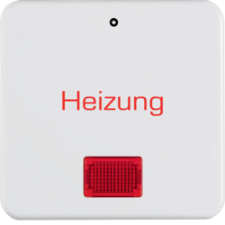 Kolébka s červenou čočkou a nápisem "Heizung Notschalter", Není vhodné pro vytápění > 50 kW, wg Up IP44, bílá, lesk