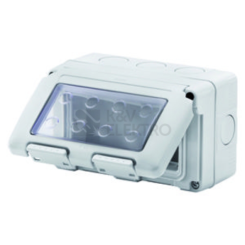 Nástěnná přístrojová krabice 27 Combi prázdná s kapacitou 4 moduly Technické parametry: Počet vylamovacích průchodek Ø23 8 Typ dvířek s průhlednou membránou Stupeň krytí IP55 Stupeň ochrany IK07 Třída ochrany II Barva šedá RAL 7035