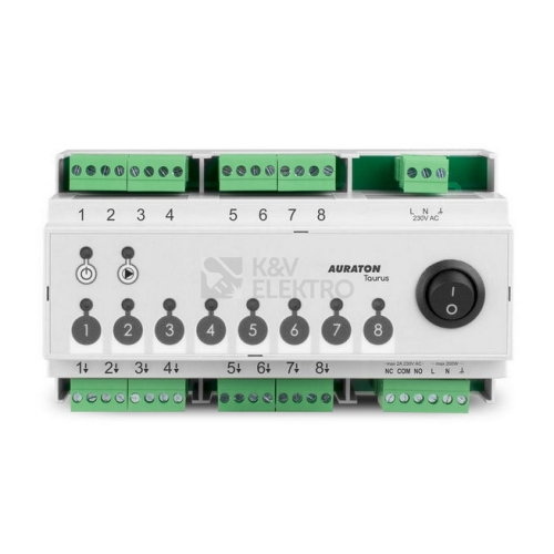 Ovládací terminál určený k montáži do rozvaděčových skříní a následnému řízení pohonů podlahového vytápění 1-8 zón. AURATON Taurus pracuje se všemi drátovými termostaty značky AURATON. Navíc disponuje výstupy pro ovládání kotle a oběhového čerpadla. Popis Svorkovnice pro ovládání více okruhů vytápění 8 zón vytápění (8x vstup pro termostat, 8x výstup 230V pro termopohon) Na každou zónu lze připojit až 3 servopohony AURATON TE 230 PRO Jednoduchá obsluha a montáž na DIN lištu Výstup pro řízení oběhového čerpadla (230V) Výstup pro ovládání kotle (beznapěťový kontakt) V případě, že některá zóna začne otevírat okruh vytápění, dojde k sepnutí kotle/čerpadla Odnímatelné svorky pro snadnější montáž Specifikace Napájení 230VAC 50Hz Počet nezávisle řízených okruhů až 8 Možnost připojení až 8 termostatů Výstup pro připojení pohonů 230V / 30W na každou zónu (až 3 pohony značky AURATON na zónu) Max. zatížení relé pro spínání čerpadla 230V 200 W Max. zatížení beznapěťového kontaktu pro spínání kotle: 230 VAC, 2A Optická signalizace provozu LED Způsob montáže lišta DIN Stupeň ochrany IP 20