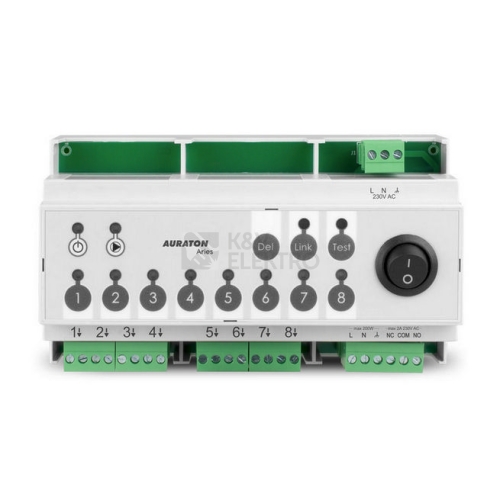 Bezdrátový ovládací terminál určený k montáži do rozvaděčových skříní a následnému řízení pohonů podlahového vytápění 1-8 zón. AURATON Ariex pracuje se všemi bezdrátovými termostaty značky AURATON (např. Aquila, Tucana). Navíc disponuje výstupy pro ovládání kotle a oběhového čerpadla. Popis Bezdrátová svorkovnice pro ovládání více okruhů vytápění 8 zón vytápění (8 kanálů pro bezdrátový přenos, 8x výstup 230V pro termopohon) Každá z 8 zón je monitorována bezdrátovým termostatem (např. Aquila, Tucana, Pavo, Libra, T-1R) Vybaven funkcí TEST - umožňuje ověřit sílu signálu s připárovanými termostaty Na každý výstup lze připojit až 3 servopohony AURATON TE 230 PRO Jednoduchá obsluha a montáž na DIN lištu Výstup pro spínání oběhového čerpadla (230V) Výstup pro ovládání kotle (beznapěťový kontakt) V případě, že některá zóna začne otevírat okruh vytápění, dojde k sepnutí kotle/čerpadla Odnímatelné svorky pro snadnější montáž Specifikace Napájení 230VAC 50Hz Počet nezávisle řízených okruhů až 8 Možnost připojení až 8 bezdrátových termostatů Výstup pro připojení pohonů 230V / 30W na každou zónu (až 3 pohony značky AURATON na zónu) Max. zatížení relé pro spínání čerpadla 230V 200 W Max. zatížení beznapěťového kontaktu pro spínání kotle: 230 VAC, 2A Optická signalizace provozu LED Způsob montáže lišta DIN Stupeň ochrany IP 20