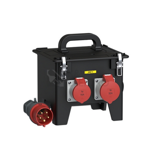 Zásuvka 1x CEE 32A 5p 400V, 1x CEE 16A 5p 400V, 2x 16A 230V, chránič 4p, jističe, kabel s vidlicípřívodní kabel s vidlicí 32A/400V/5p se změnou fáze