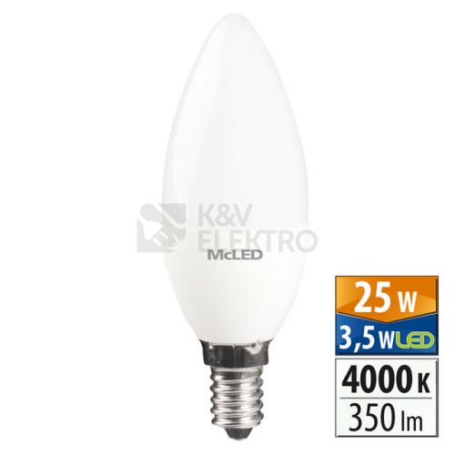 LED žárovka B35 svíčka 3,5 W (ekvivalent 25 W), patice E14, 230 V, 4000 K - neutrální bílá, světelný tok 350 lm, vyzařovací úhel 180 °, Ra>80, úspora až 92 %, životnost až 25.000 h, 20.000 spínacích cyklů, A+, rozměry ø 35 x 108 mm, nestmívatelná.