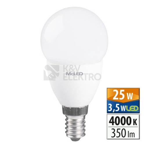 LED žárovka G45 kapka 3,5W (ekvivalent 25W), patice E14, 230V, 4000K - neutrální bílá, světelný tok 350lm, vyzařovací úhel 180°, Ra>80, úspora až 86%, životnost až 25.000h, 20.000 spínacích cyklů, A+, rozměry ø 45 x 91 mm, nestmívatelná