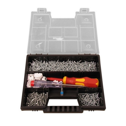 Elektromontážní PROFI sada je základní stavební materiál každého elektrospecialisty - s touto sadou upevníte až 250 domovních spínačů, přepínačů a zásuvek. Rozměry vrutů jsou pečlivě voleny s ohledem na nejpoužívanější délky používané v praxi. Součástí balení je doporučený šroubovák PZ1, fázová zkoušečka 220-250V, bit PZ1 a SDKF 3 svorky pro pevné i laněné vodiče o průřezu 0,2-2,5mm2. Baleno v praktické kompaktní plastové uzavíratelné krabičce.