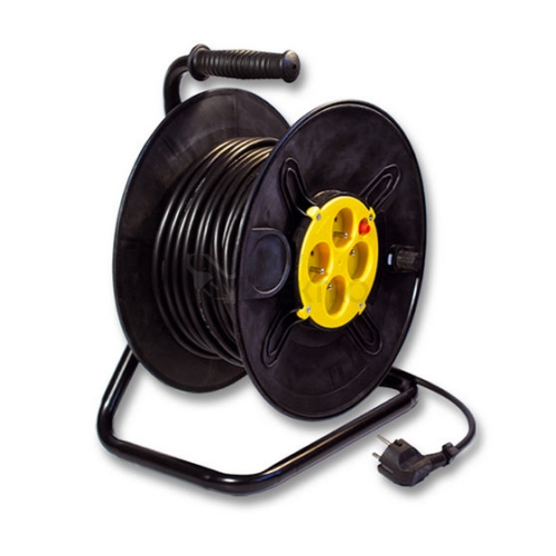 Černý prodlužovací kabel na navinovacím bubnu pro vnitřní použití. Disponuje 4 zásuvkami, tepelnou pojistkou a kabelem s průřezem 1,5 mm2. Zásuvky a zástrčka jsou vyrobeny z plastu, izolace z PVC.