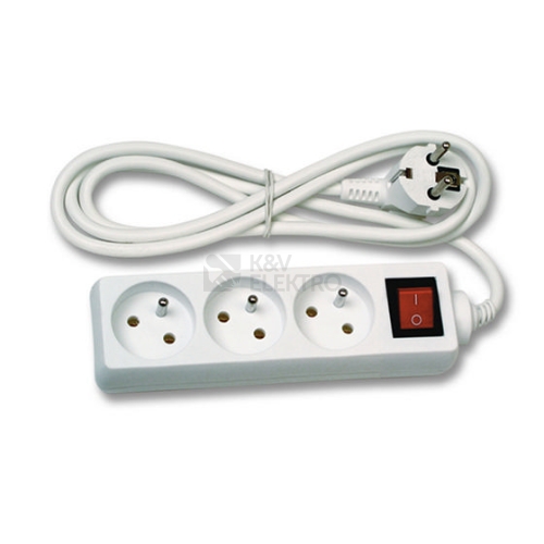 Standardní prodlužovací kabel bílé barvy pro vniřní použití. Je vybaven kolébkovým vypínačem a dětskými clonkami. Zásuvka a vidlice je vyrobena z plastu, izolace z PVC.