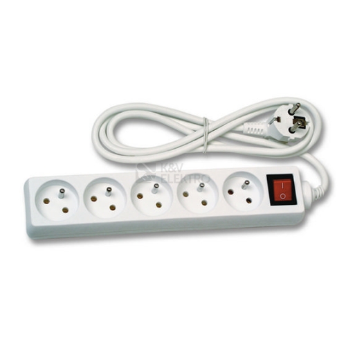 Standardní prodlužovací kabel bílé barvy pro vniřní použití. Je vybaven kolébkovým vypínačem a dětskými clonkami. Zásuvka a vidlice je vyrobena z plastu, izolace z PVC.