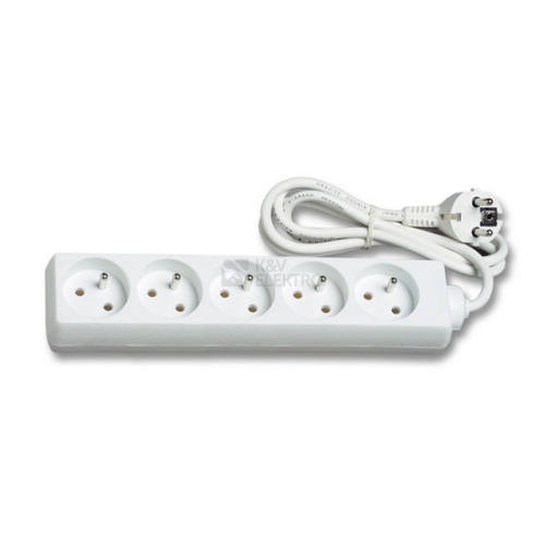 Standardní prodlužovací kabel bílé barvy pro vniřní použití s dětskými clonkami. Zásuvka a vidlice je vyrobena z plastu, izolace z PVC.
