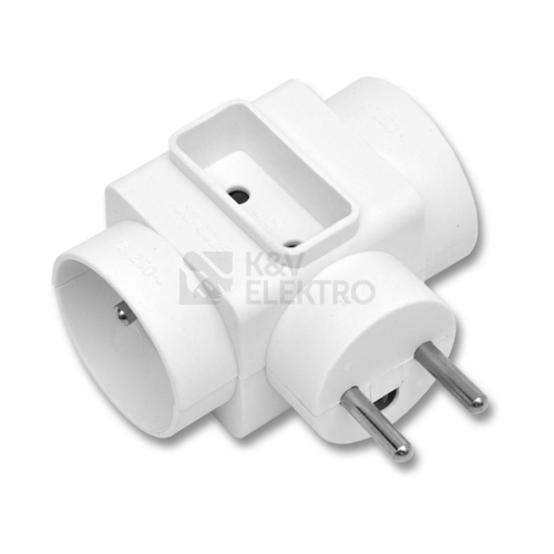 Standardní rozbočovací zásuvka bílé barvy pro vnitřní použití se 3 zásuvkami bez dětských clonek. Tato T-rozbočka není vybavena vypínačem, stupeň ochrany je IP20.
