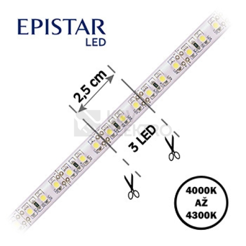 Flexibilní pásek s LED SMD diodami, efektivně vyzařujícími světlo, je vhodný pro dekorativní nasvícení interiérů, náročné osvětlovací systémy, ale i pro reklamní účely. Velkou předností je velká svítivost a napájení malým napětím 12 V DC (příp. 24 V DC, dle typu) a snadné ovládání pomocí volitelných spínačů, stmívačů či ovladačů. Díky sério-paralelnímu zapojení lze pásek jednoduše dělit po jednotlivých modulech. Pro snadnou montáž je jedna strana pásku opatřena oboustrannou lepící páskou firmy 3M.Technické parametry: Příkon (W): 20 Světelný tok (lm): 2050 Barevná teplota: 4000 - 4300 K Počet LED/m: 120 LED/m Typ LED čipu: 2835 Výrobce LED čipu: Epistar Vyzařovací úhel: 120° Index podání barev: Ra > 94 Krytí: IP20 Pracovní teplota: -25 °C až +50 °C Napájecí napětí: 12 V DC Počet LED / Délka modulu: 3 LED / 2,5 cm Rozměry: 10 x 2,4 mm Balení: 10 m