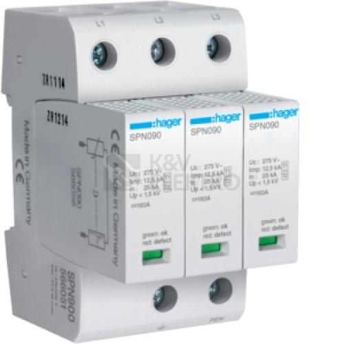 Kombinovaný svodič přepětí T1+T2, Iimp 12,5 kA (10/350), 3-pól pro síť TN-C, MOV