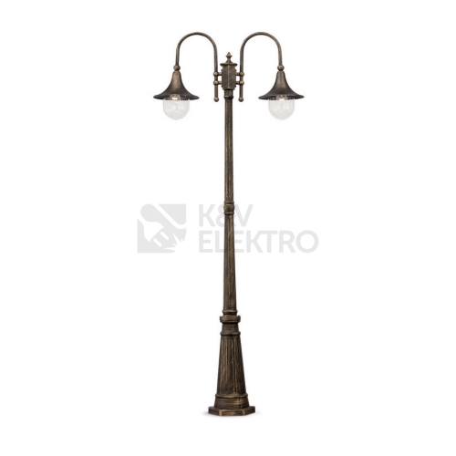 Sloupové svítidlo Cima PT2 z kolekce venkovního osvětlení Ideal Lux v klasickém provedení o celkové výšce 216 cm se zvonovitým tvarem difuzorů o průměru 25 cm je typickým osvětlením pro městské parky a zeleně. Bytelná základna má průměr 23 cm. Svítidlo je vyrobené z litého hliníku s povrchovou úpravou antické černé, tedy černý podklad se zlatou patinou. Dvě obloukovitá ramena jsou umístěna v horní části obou difuzorů, které jsou doplněny o čiré akrylové kryty a osazeny paticí E27 o maximálním příkonu 2 x 60W. Zdroje nejsou součástí balení, doporučujeme zvolit LED filamentové žárovky, které podtrhnou vzhled celého svítidla. Krytí IP43 je vhodné pro montáž do exteriéru.