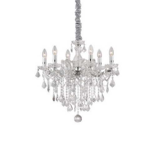 Stylový křišťálový závěsný lustr FLORIAN SP6 z kolekce interiérového osvětlení Ideal Lux v nejmenším provedení o průměru 60 cm zazáří v jakémkoli interiéru, jeho design vynikne především v prostoru s vysokým stropem. Kovový rám s rameny ve stříbrné barvě kombinovaný s čirým sklem je ozdoben křišťálovými přívěsky ve tvaru osmiúhelníků a kapek. Závěsný řetěz je potažen šedým sametem a délku jeho zavěšení lze libovolně nastavit při instalaci podle potřeby od 77 cm do 120 cm. Lustr je osazen paticemi E14 o maximálním příkonu 6 x 40 W. Žárovky nejsou součástí balení, pro úsporu elektrické energie doporučujeme použít LED světelné zdroje ve tvaru svíčky (typ B35 a BA35). Krytí IP20 je vhodné pro použití do interiéru.
