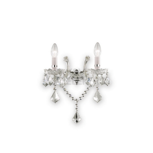 Stylové křišťálové nástěnné svítidlo FLORIAN AP2 z kolekce interiérového osvětlení Ideal Lux zazáří v jakémkoli interiéru. Kovový rám s rameny ve stříbrné barvě kombinovaný s čirým sklem je ozdoben křišťálovými přívěsky ve tvaru osmiúhelníků a kapek. Svítidlo je osazeno paticemi E14 o maximálním příkonu 2 x 40 W. Žárovky nejsou součástí balení, pro úsporu elektrické energie doporučujeme použít LED světelné zdroje ve tvaru svíčky (typ B35 a BA35). Krytí IP20 je vhodné pro použití do interiéru