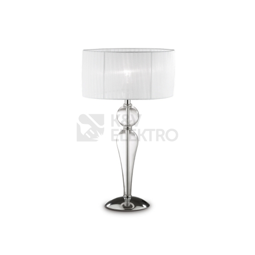 Dekorativní stolní lampička Duchessa TL1 z kolekce Ideal lux ve větším provedení o celkové výšce 64cm je vhodná do klasicky zařízených hotelových a restauračních interiérů. Skládá se z kovové základny s leskle chromovou povrchovou úpravou, ručně tvarovaného a foukaného těla z čirého skla a bílého stínidla z organzy, které je osazeno paticí E27 o maximálním příkonu 1 x 60W. Zdroj není součástí balení, doporučujeme použít LED žárovku pro úsporu elektrické energie. Vypínač je umístěn na čirém přívodním kabelu. Krytí IP20 je vhodné pro vnitřní užití.