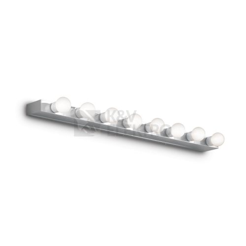 Zajímavé nástěnné svítidlo z kolekce designového osvětlení Ideal Lux v delším provedení o délce 80,5 cm v chromové barvě vhodné především k nasvícení zrcadel, chodeb, ale i stěn obývacích prostorů. Svítidlo tvoří pouze kovový rám, který je osazen paticemi E14 o maximálním příkonu 8 x 40 W. Žárovky, které nejsou součástí balení, nepřekrývá žádný difuzor a svítidlo tak poskytuje řadu možností, jak měnit jeho vzhled použitím různých typu žárovek s danou paticí. Krytí IP20 je vhodné pro použití do interiéru.