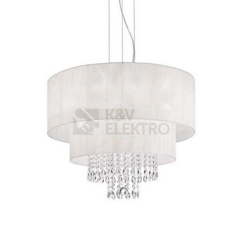 Luxusní závěsný lustr z kolekce interiérového osvětlení italské značky Ideal Lux v menším provedení o průměru 71 cm ideální k rozsvícení obývacího pokoje, ložnice, jídelny nebo hotelového interiéru. Kovovou základnu doplňují dvě do sebe vsazená stínítka z PVC folie s jemnými metalickými nitkami v bílé barvě a ověsky z broušeného křišťálu. Délku zavěšení ocelových lanek lze libovolně nastavit při instalaci podle potřeby od 68 cm do 120 cm. Lustr je osazen paticemi E27 o maximálním příkonu 6 x 60 W. Žárovky nejsou součástí balení. Pro úsporu elektrické energie doporučujeme použít úsporné LED světelné zdroje. Krytí IP20 je vhodné pro použití do interiéru.