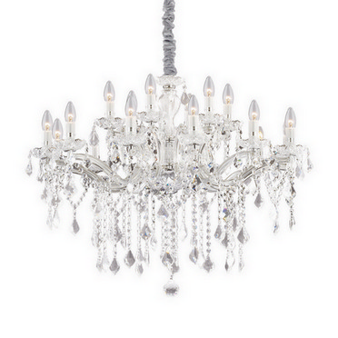 Stylový křišťálový závěsný lustr FLORIAN SP18 z kolekce interiérového osvětlení Ideal Lux v největším provedení o průměru 86 cm zazáří v jakémkoli interiéru, jeho design vynikne především v prostoru s vysokým stropem. Kovový rám s rameny ve stříbrné barvě kombinovaný s čirým sklem je ozdoben křišťálovými přívěsky ve tvaru osmiúhelníků a kapek. Závěsný řetěz je potažen šedým sametem a délku jeho zavěšení lze libovolně nastavit při instalaci podle potřeby od 95 cm do 123 cm. Lustr je osazen paticemi E14 o maximálním příkonu 18 x 40 W. Žárovky nejsou součástí balení, pro úsporu elektrické energie doporučujeme použít LED světelné zdroje ve tvaru svíčky (typ B35 a BA35). Krytí IP20 je vhodné pro použití do interiéru.