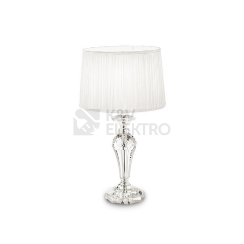 Stolní lampa Kate-2 TL1 z kolekce dekorativního osvětlení Ideal Lux o celkové výšce 56cm a kruhovém stínidlu projasní každý klasicky zařízený interiér. Její mohutné tělo je vyrobeno z broušeného čirého křišťálu, na jehož vrcholu je bílé stínidlo z dvouvrstvé tkaniny osazené paticí E27 o maximálním příkonu 1 x 60W. Zdroj není součástí balení, doporučujeme zvolit LED žárovku s dlouhou životností. Vypínač je umístěn na přívodním kabelu. Krytí IP20 je určeno pro vnitřní umístění lampičky.