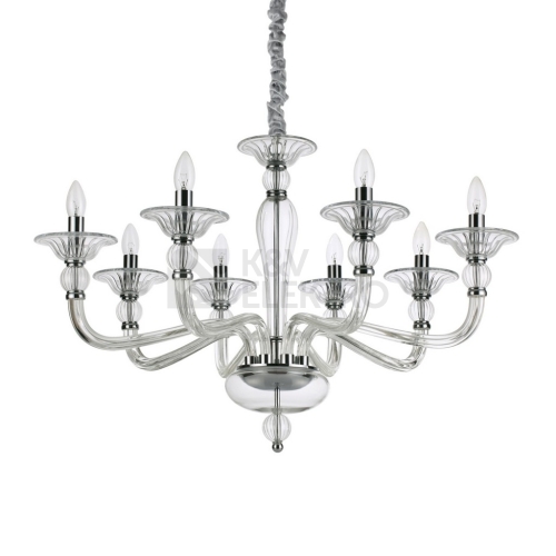 Elegantní nenápadný závěsný lustr z kolekce interiérového osvětlení Ideal Lux se velmi dobře hodí do klasických i moderních prostor s vyššími stropy. Rám jemného svítidla je kovový s chromovou povrchovou úpravou. Skleněná ramena o celkovém průměru 85 cm a dekorativní prvky jsou vyrobeny z foukaného skla. Délku zavěšení řetízku se sametovým potahem lze flexibilně nastavit dle potřeby při instalaci svítidla od 83 cm do 150 cm. Svítidlo je osazeno paticemi E14 o maximálním příkonu 8 x 40 W. Žárovky nejsou součástí balení. Doporučujeme zvolit LED žárovky ve tvaru kapky nebo svíčky, které vyzdvihnou elegantní klasický design lustru a zároveň šetří náklady na elektrickou energii. Krytí IP20 je vhodné pro použití do interiéru.