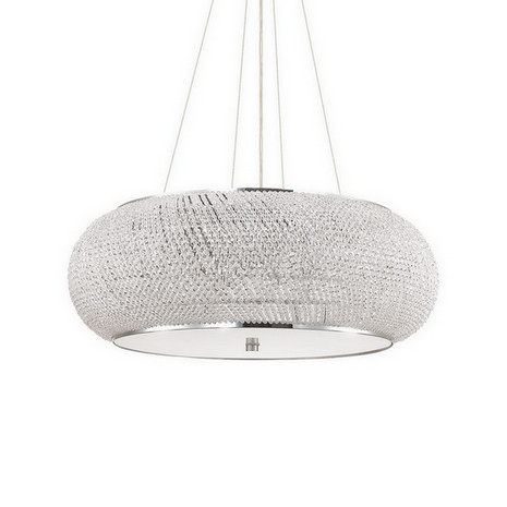 Luxusní křišťálový závěsný lustr PASHA SP14 z kolekce interiérového osvětlení Ideal Lux v největším provedení o průměru 65 cm v chromové barvě se stane ideální volbou k rozsvícení obývacích prostorů, haly, ložnice nebo hotelových interiérů. Dominantou je stínidlo složené z křišťálových drátků v lesklém chromovém provedení, které vytváří na stěnách krásné světelné efekty. Spodní stranu stínidla uzavírá difuzor z mléčného pískovaného skla. Délku ocelových lanek, která spojuje kovová základna o průměru 14 cm, lze libovolně nastavit při instalaci podle potřeby od 41 do 120 cm. Lustr je osazen paticemi E14 o maximálním příkonu 14 x 40 W. Žárovky nejsou součástí balení, doporučujeme použít úsporné LED žárovky. Krytí IP20 je vhodné pro použití do interiéru.