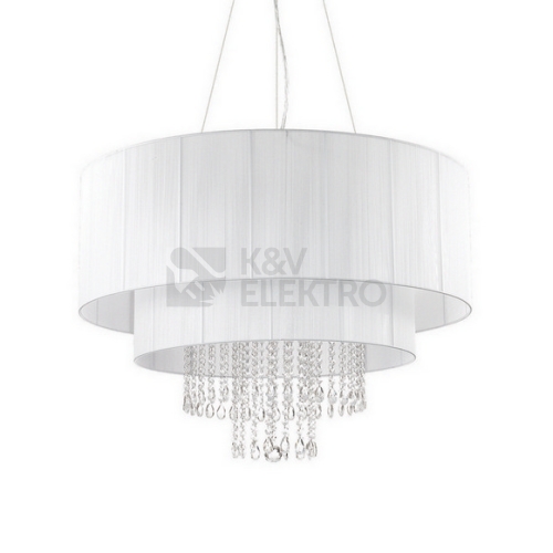 Luxusní závěsný lustr z kolekce interiérového osvětlení italské značky Ideal Lux v největším provedení o průměru 90 cm ideální k rozsvícení obývacího pokoje, ložnice, jídelny nebo hotelového interiéru. Kovovou základnu doplňují dvě do sebe vsazená stínítka z PVC folie s jemnými metalickými nitkami v bílé barvě a ověsky z broušeného křišťálu. Délku zavěšení ocelových lanek lze libovolně nastavit při instalaci podle potřeby od 83 cm do 170 cm. Lustr je osazen paticemi E27 o maximálním příkonu 10 x 60 W. Žárovky nejsou součástí balení. Pro úsporu elektrické energie doporučujeme použít úsporné LED světelné zdroje. Krytí IP20 je vhodné pro použití do interiéru.
