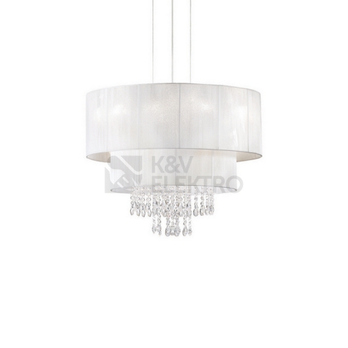 Luxusní závěsný lustr z kolekce interiérového osvětlení italské značky Ideal Lux v nejmenším provedení o průměru 50 cm ideální k rozsvícení obývacího pokoje, ložnice, jídelny nebo hotelového interiéru. Kovovou základnu doplňují dvě do sebe vsazená stínítka z PVC folie s jemnými metalickými nitkami v bílé barvě a ověsky z broušeného křišťálu. Délku zavěšení ocelových lanek lze libovolně nastavit při instalaci podle potřeby od 63 cm do 150 cm. Lustr je osazen paticemi E27 o maximálním příkonu 4 x 60 W. Žárovky nejsou součástí balení. Pro úsporu elektrické energie doporučujeme použít úsporné LED světelné zdroje. Krytí IP20 je vhodné pro použití do interiéru.